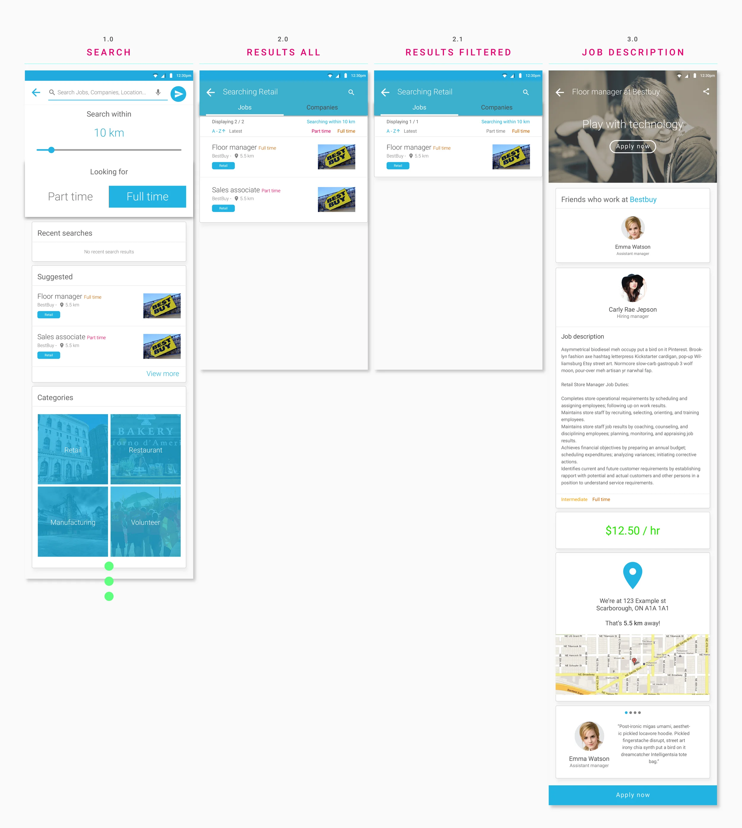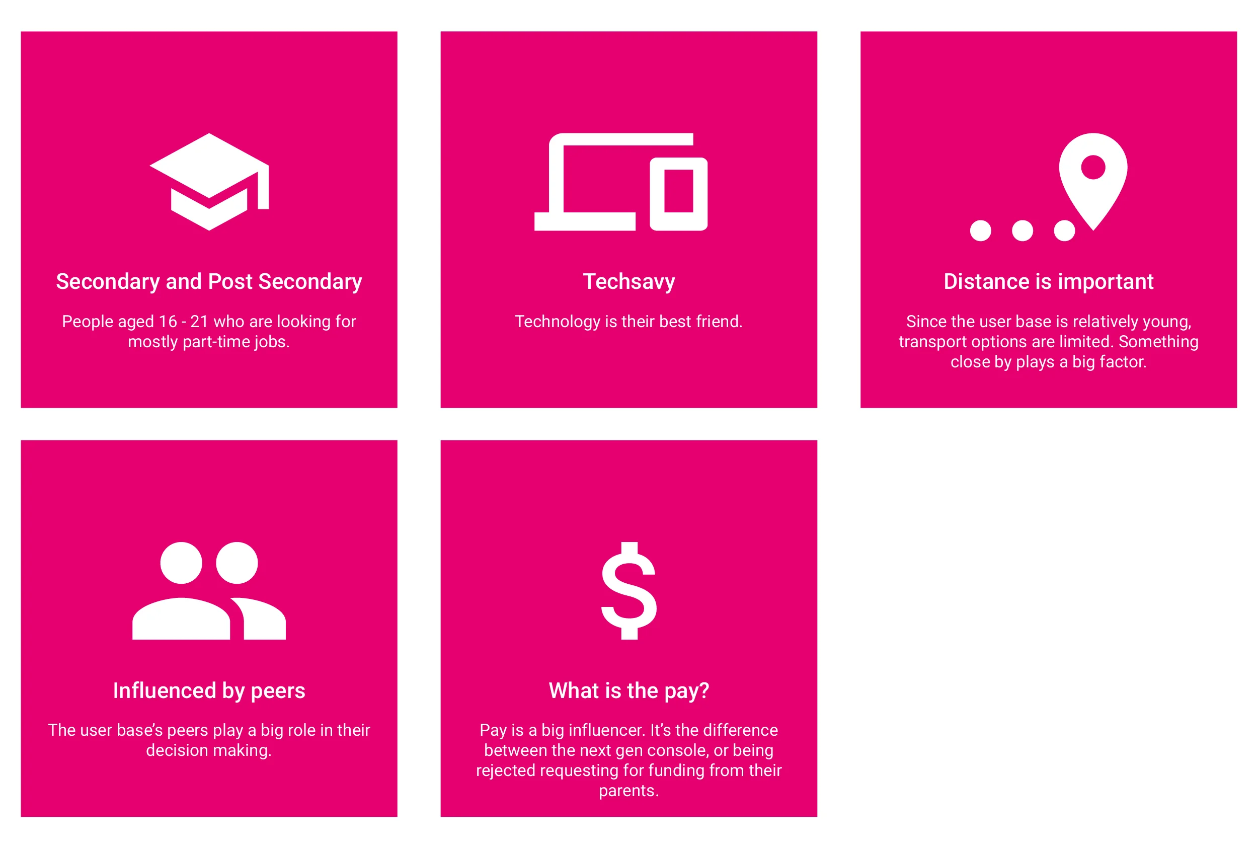Due to the limited time, brief research was conducted. It was clear that the user base comprised of mostly secondary and post-secondary students looking for jobs – mainly in the retail sector.