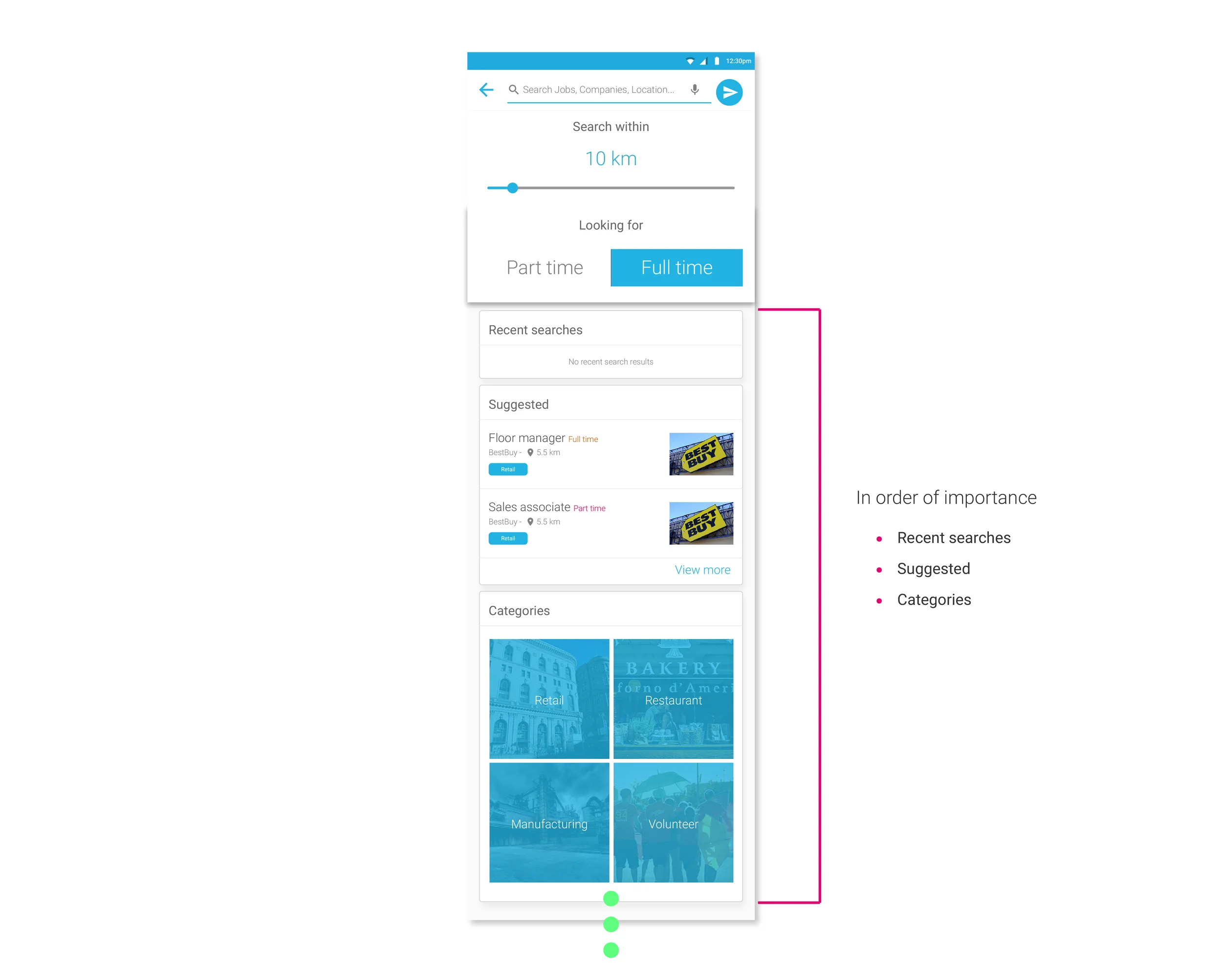 The Recent searches is listed first right after the filters for ease of access for the user to save parameters they have set before for faster search instead of re-inputting each time. It makes it easier for the user who wants to check a specific company / job they want to follow.