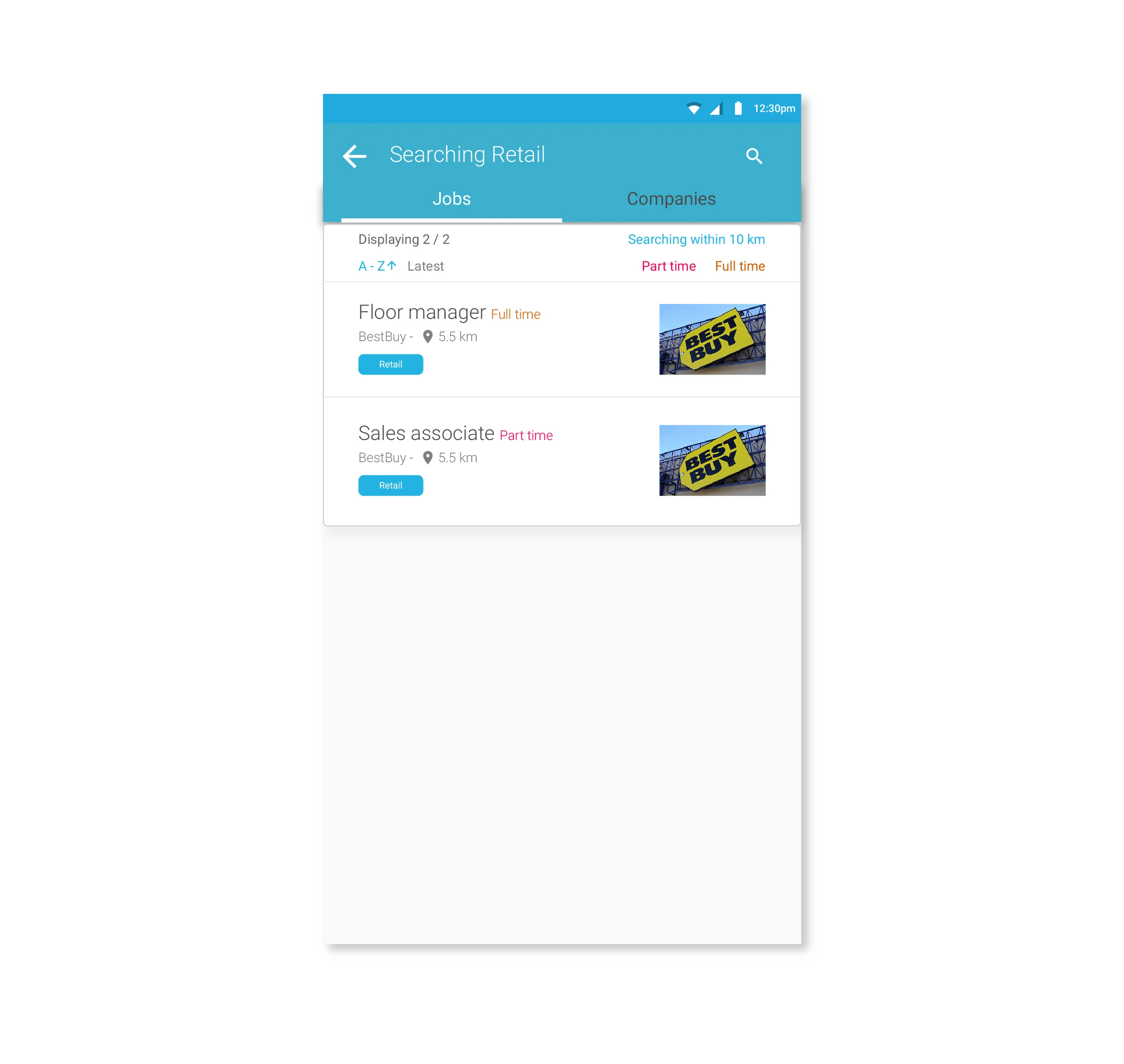 The search results page is landed on after the user has conducted a search. The search results page has 2 tabs: Jobs, and Companies. The “jobs” tab lists all open jobs depending on what parameters the user has inputted into their search previously. The “Companies” tab lists companies related to the search parameters the user has previously inputted. The “Companies” tab is a revenue generating product for the company which showcases the company in a more personable way as well as displaying their job listings.