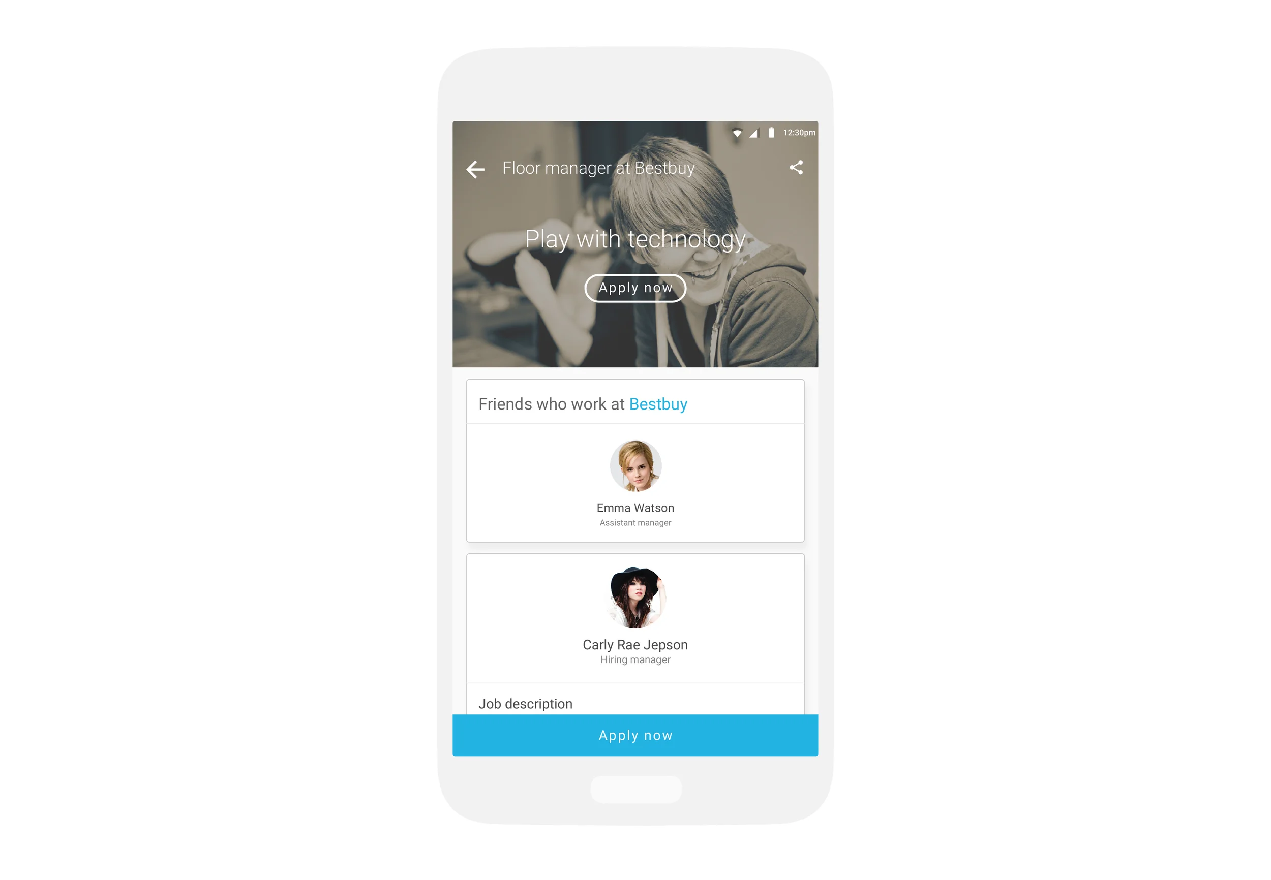 The user lands on the description page with a large image that supports brand culture, tagline, and call to action. The user then sees if any of their friends are currently working there; then job description. The pay is highlighted in green to make it feel positive, then the location is identified. For final reassurance to apply, reviews are then presented.