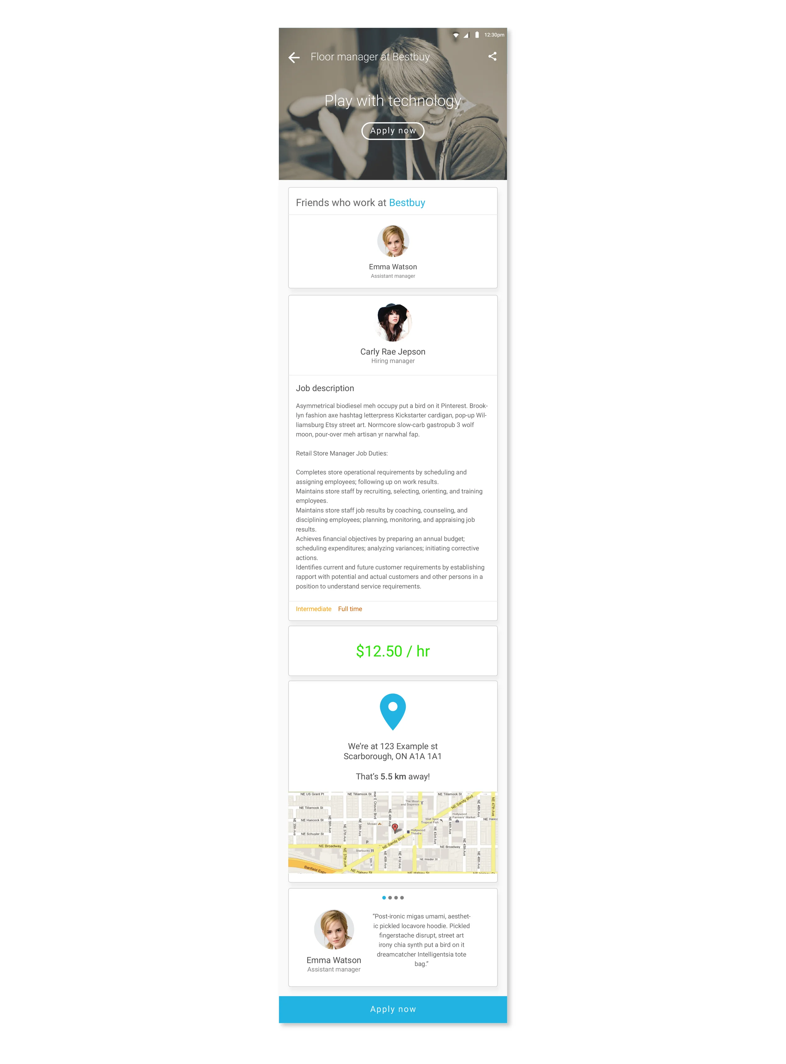 With the limited amount of time, I had to imagine myself in the shoes of the personas that would use the product. Job description, pay, location, and reviews were the first thing to come to mind when designing this page. I’ve later decided to make it personable to add in employer image, name, and title – it makes the experience more humanistic. A large image with a playful tagline in which the company can customize to match their branding was added to build a connection with the user as well as highlighting the main call-to-action which is to “Apply now”.